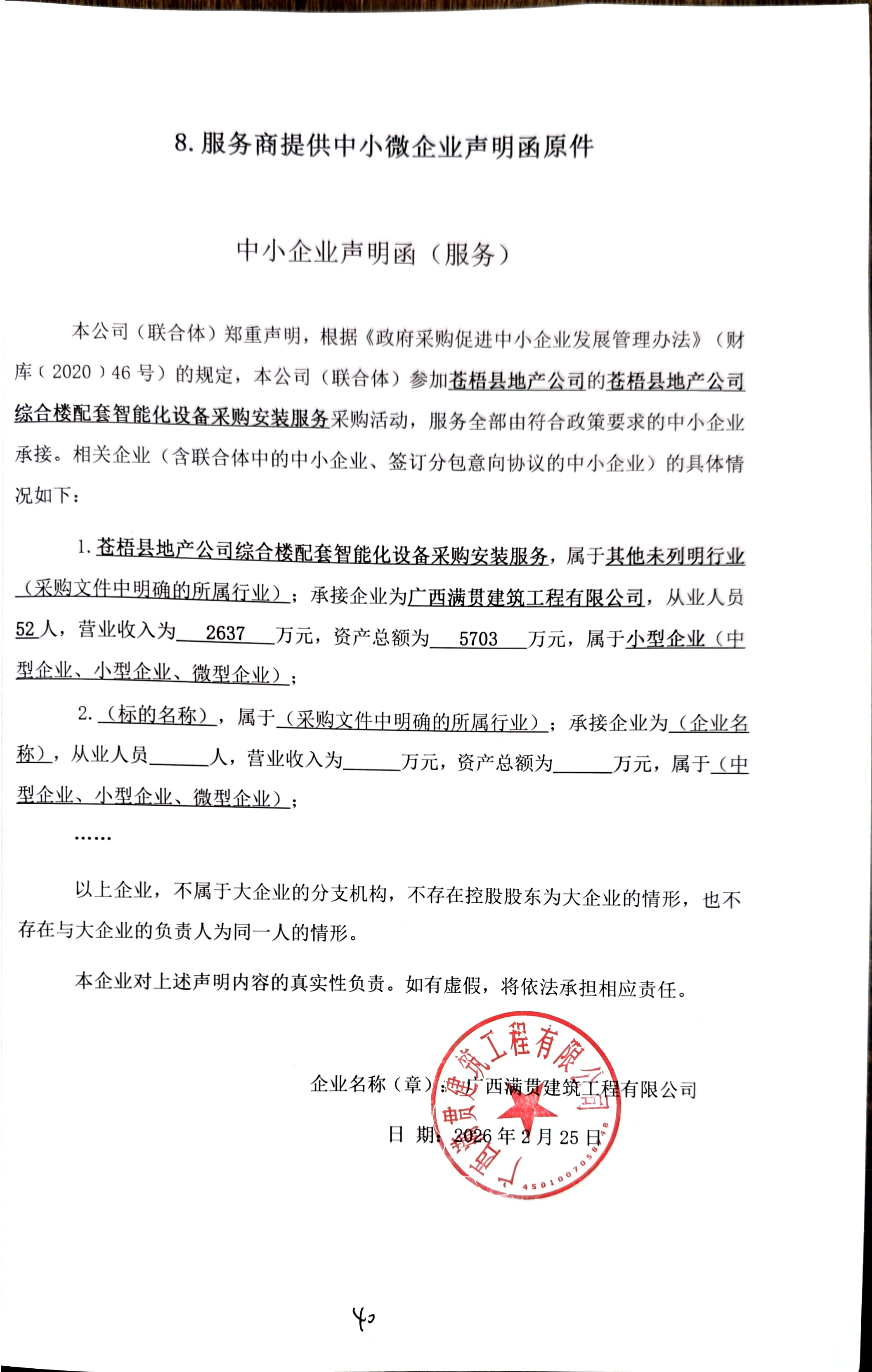 1 | 苍梧县地产公司综合楼配套智能化设备采购安装服务 | 本项目为对苍梧县地产公司综合楼配套智能化会议室设备采购、光电控制、机房、办公区综合布线及配电安装、机房消防系统、门禁系统、网络布线及组网等安装服务,具体内容详见竞争性磋商文件。 | 在2026年 3 月 31 日前完成 | 符合现行国家相关标准、行业标准、地方标准或者其他标准、规范。 |